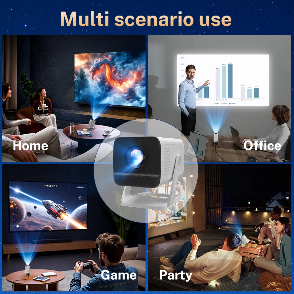 This projector can be used in multiple scenarios and is very suitable for home theater, dormitory projection, office presentations, outdoor movies, and games. It can easily adapt to any environment.
