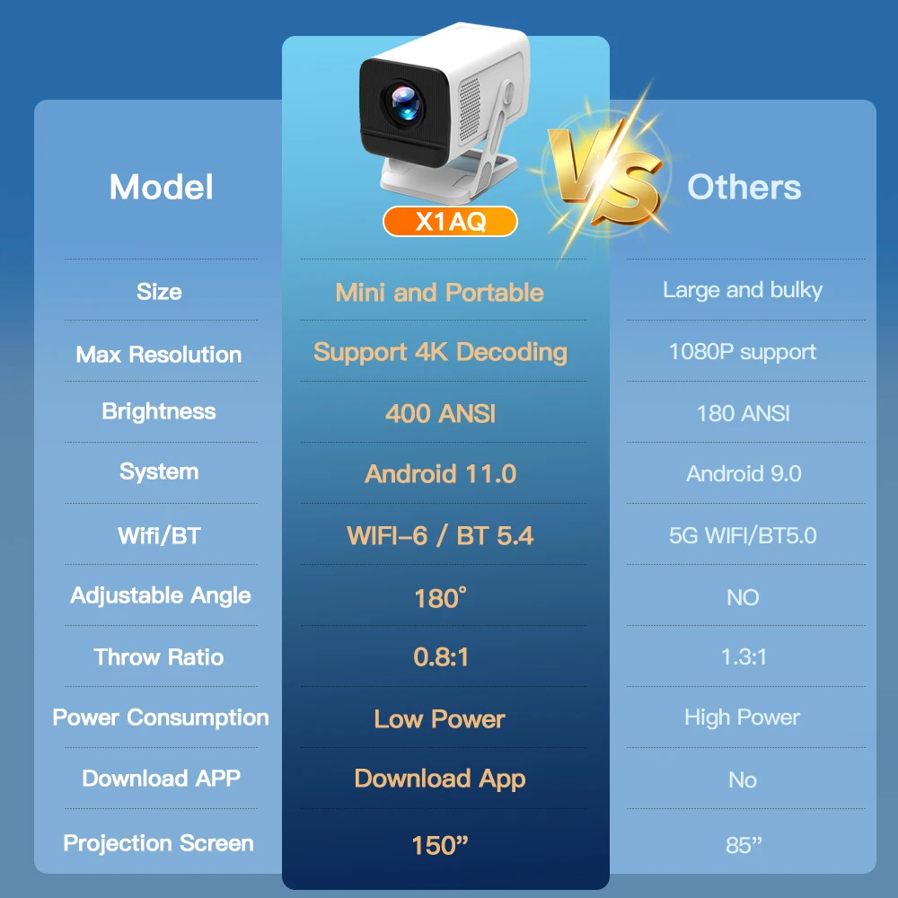 - Smart Features: Android 11 system, built-in apps, WiFi 6, Bluetooth 5.4, electronic keystone correction, x1.5 zoom, multiple projection modes (ceiling, back, mirror, throwing).